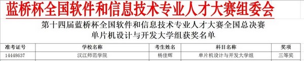 日前,第十四届“蓝桥杯”大赛全国总决赛成绩揭晓,304永利集团杨佳辉同学喜获电子类(单片机设计与开发大学组)三等奖的好成绩。