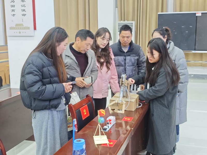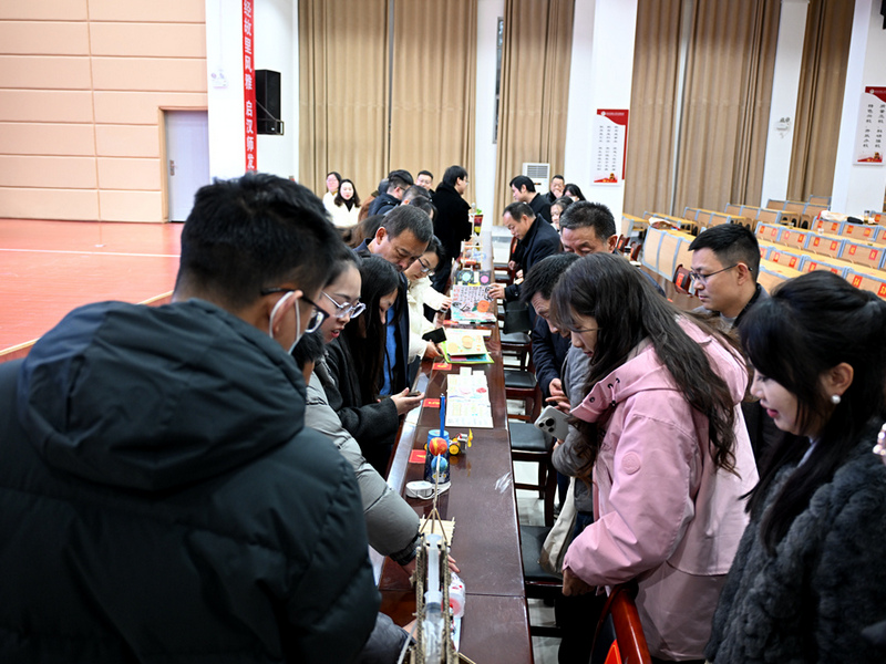 报告会结束,科学教育专业员工科技成果展示区的《地球为什么会转》《蔬菜水果王国》等自制科普书,等离子炮、抛石机、地球圈层结构模型等自制教具,吸引了与会教师目光,大家纷纷驻足观看、拍照、操作。