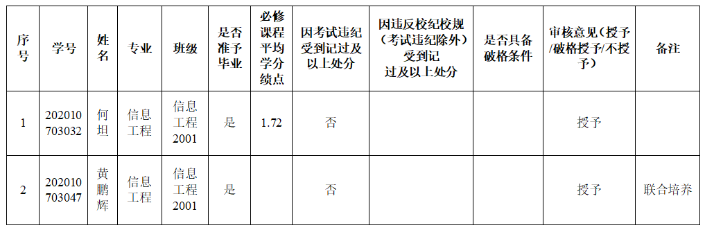 根据《国务院学位委员会关于印发〈学士学位授权与授予管理办法〉的通知》(学位〔2019〕20号)《304永利集团普通全日制本科生学士学位授予工作实施细则》等文件规定,经过公司学位评定分委员会审核,同意拟授予何坦、黄鹏辉等2名2024届本科毕业生学士学位。现将拟授予学士学位情况予以公示,公示时间为12月3日至12月5日,如有异议,请在12月5日前向304永利集团反映。联系人:刘锋,联系电话:13677194498,联系邮箱:782127156@qq.com。