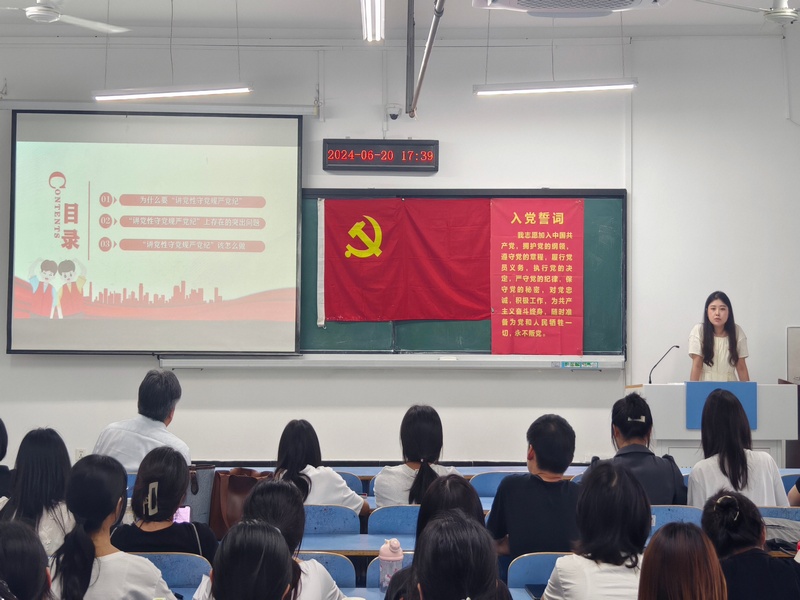 6月20日下午,教工党支部书记周鹏、员工党支部书记王超然分别为师生党员讲授专题党课。党课聚焦“六大纪律”,要求全体党员始终牢记党的纪律是刚性约束,守好纪法“总开关”,牢牢守住底线红线,党员老师要严守师德,教书育人,员工党员要模范遵守校纪校规,发挥模范带头作用。
