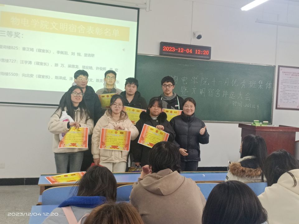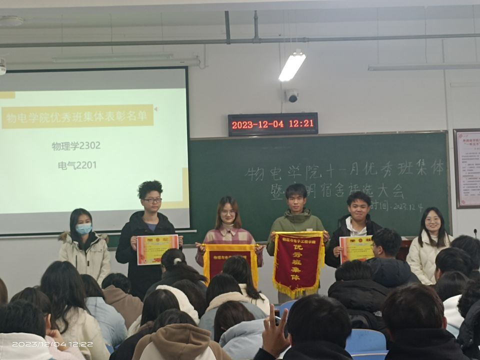 会议伊始,院分党委副书记戴俊强调了良好的班风和学风对同学成长的重要意义,要求广大同学以“四个文明”创建为契机,向先进看齐,持之以恒加强优良学风和班风建设。随后,自律委员会、员工会相关负责人详细讲解了评选标准和程序。最终,时雨楼412、时雨楼413、时雨楼5515、时雨楼5509、夏荷楼825、春雪楼727获得11月份“文明宿舍”称号,物理学2302班、电气工程2201班获得11月份“优秀班集体”荣誉称号,与会的老师为先进集体颁发了奖状和奖品。