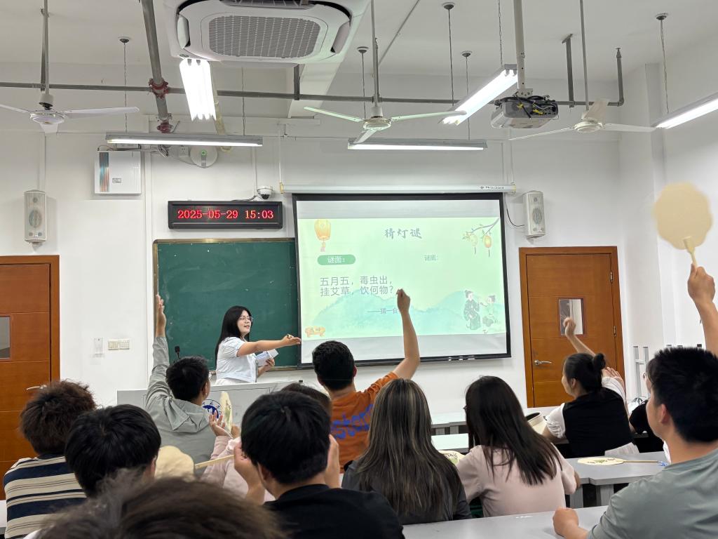 在知识闯关环节,活动围绕端午节的起源、习俗、诗词等方面设置了丰富多样的题目。同学们积极思考、踊跃答题,在抢答过程中,少数民族员工代表也积极参与其中,与汉族同学相互交流、共同探讨,展现出对中华传统文化的浓厚兴趣。emoji猜成语环节将现代网络文化与传统成语相结合,为活动增添了一份别样的趣味。屏幕上出现的一组组由emoji表情组成的图案,考验着同学们的联想能力和文化底蕴。猜灯谜的内容涵盖了文学、历史、科学等多个领域,灯谜不仅考验着同学们的知识储备,更激发了他们的智慧和创造力。