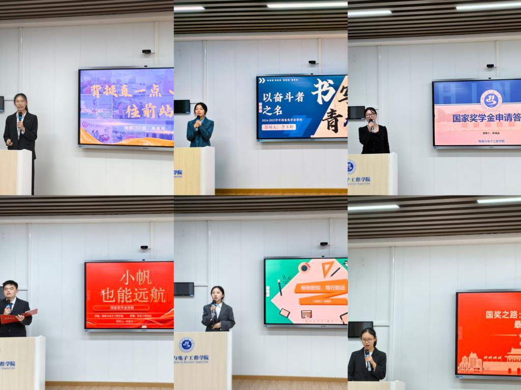 经个人申报、公司初审,最终确定19名优秀学子进入答辩环节。答辩同学按照抽签顺序依次登台,通过精心准备的PPT,从思想表现、学业成绩、科研创新、志愿服务及社会实践等维度展示了一学年来的成长、收获和感悟。答辩环节,他们以敏捷的思维、清晰的逻辑、饱满的热情和自信的姿态,赢得了现场老师和同学的阵阵掌声。